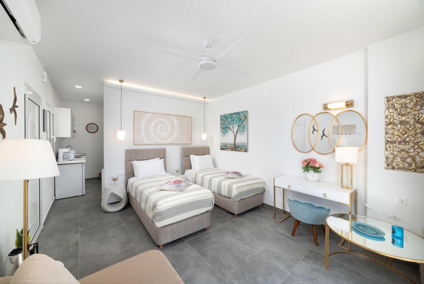 One-Bedroom Apartment. In the kitchen, guests will find a stovetop, a refrigerator, kitchenware and a microwave. The air-conditioned apartment features a flat-screen TV with streaming services, a private entrance, a tea and coffee maker, a wardrobe as well as sea views. The unit has 2 beds.