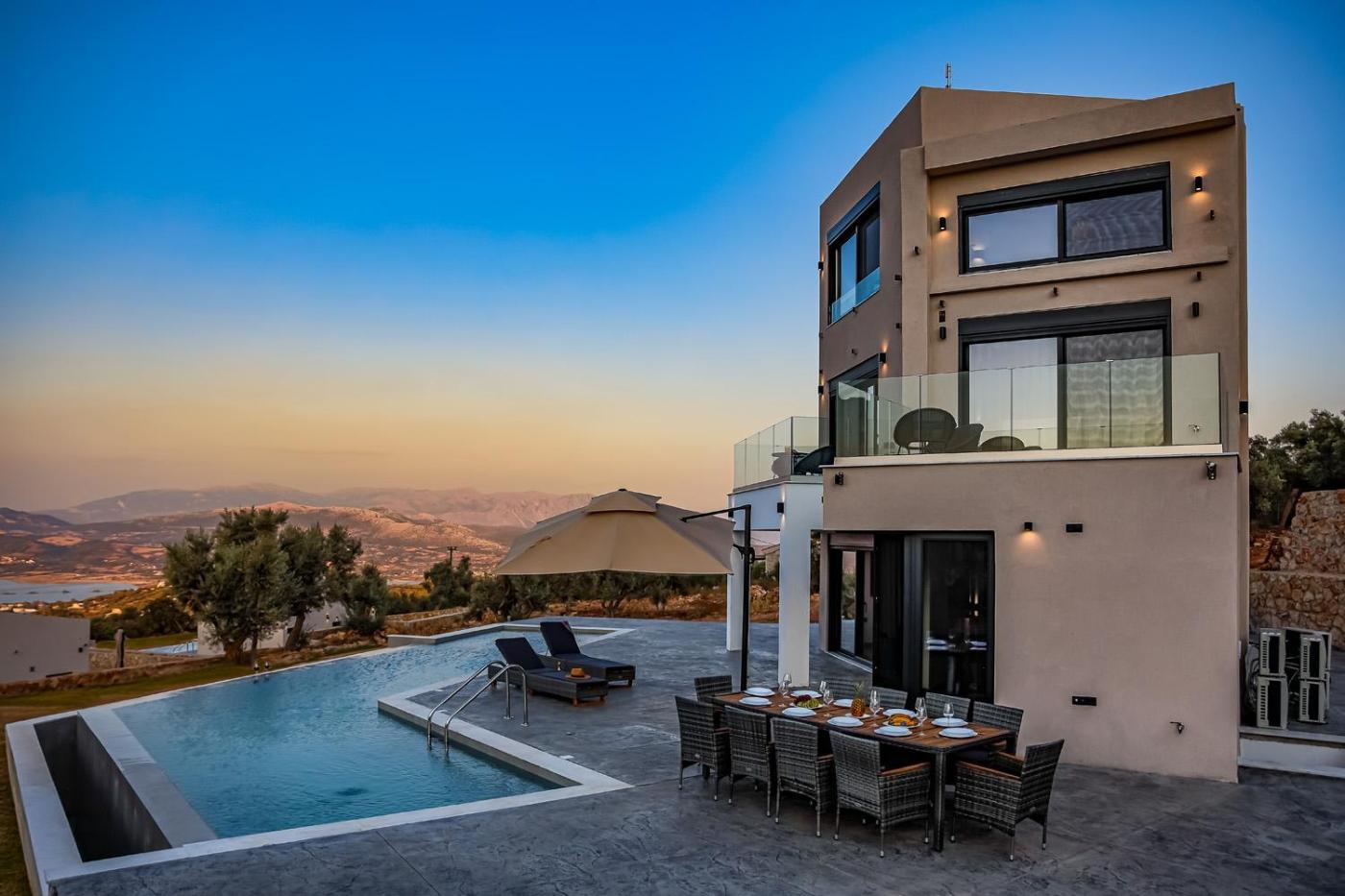 The villa comes with 5 bedrooms, 5 bathrooms, bed linen, towels, a TV, a dining area, a fully equipped kitchen, and a patio with sea views. The property has an outdoor dining area.