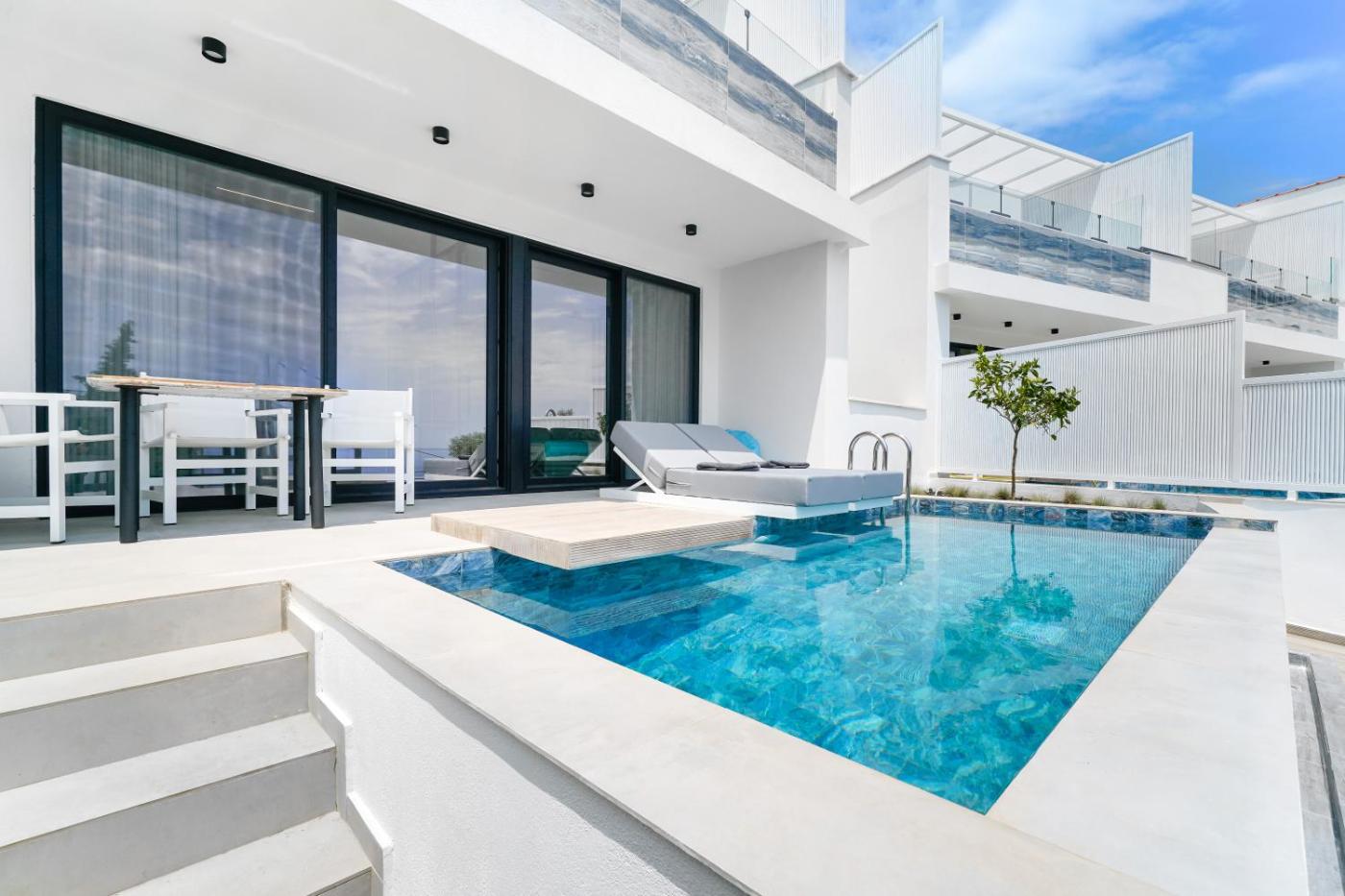 Deluxe Suite. This suites special feature is the pool with a view. Featuring a private entrance, this air-conditioned suite comprises 1 living room, 1 separate bedroom and 1 bathroom with a shower and a hairdryer. Boasting a terrace with sea views, this suite also provides soundproof walls and a flat-screen TV. The unit offers 2 beds. ;