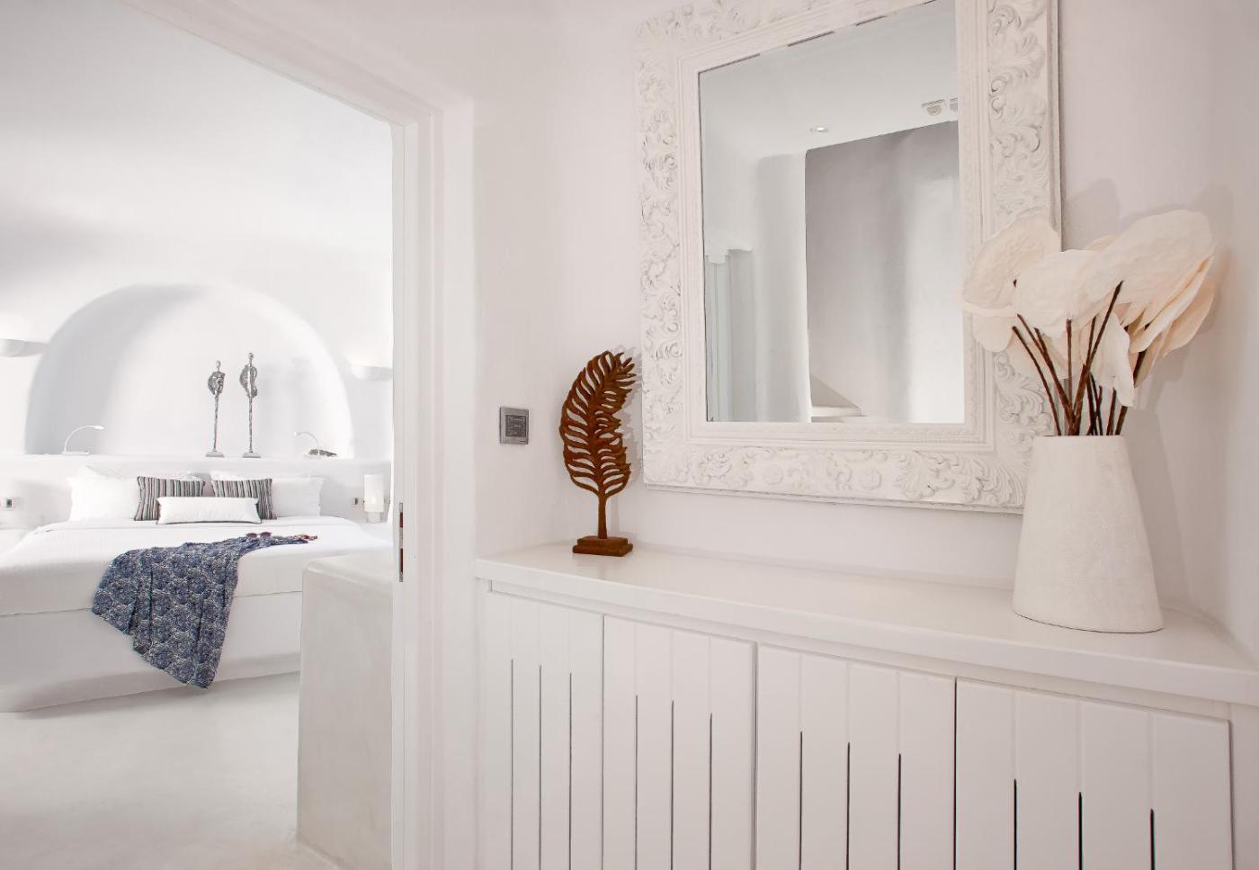 Superior Suite. The Superior Suites are designed with stylish decorative details creating a delightful atmosphere. They feature a separate bedroom with one double bed and a living room with one single bed. The bathroom comes with large shower facilities with double rain showers. The private balcony offers breathtaking views of the Caldera, Aegean Sea and the volcano, while double loungers and sofas are provided ;