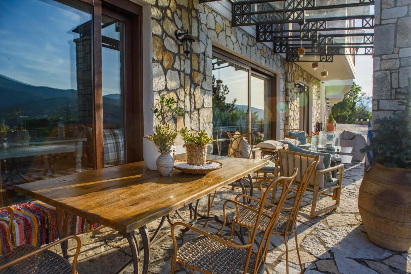 Maisonette - Split Level (2 Adults). Split in 2 levels, this suite features a living area with fireplace and it is equipped with a DVD player, 2 flat-screen TVs and free toiletries. It opens out to a balcony with views of the mountain and the city of Kalavrita. ;