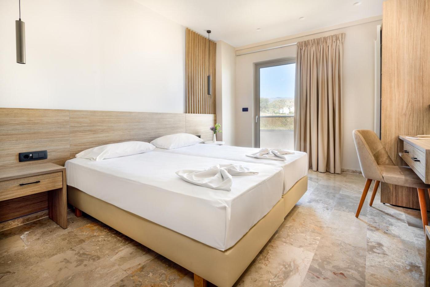 The bright rooms and suites of the Elena Beach have tiled floors, modern furnishings and floor-to-ceiling windows. Most enjoy direct views over Kissamos Bay, and satellite TVs, air conditioning and fridges are standard. Free Wi-Fi is available in the hotel lounge.