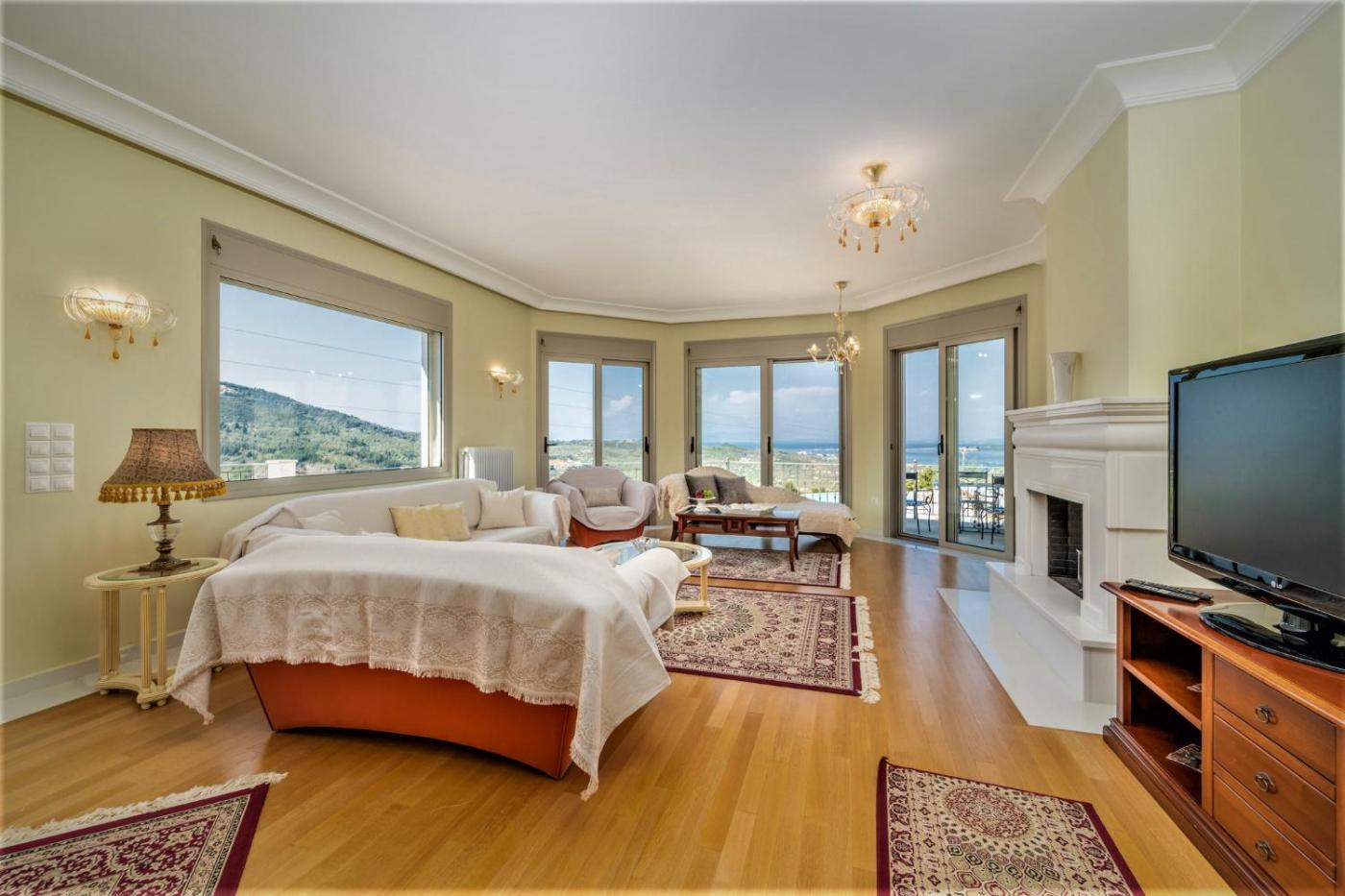 Villa with Sea View. Fitted with wooden floors, classic furnishings and floor-to-ceiling windows, the air-conditioned villa Skyfall has 4 bedrooms, a spacious living room with fireplace and a fully equipped kitchen with dining area. Facilities include a washing machine, a microwave, a DVD player and a flat-screen, satellite TV. The balcony offers views over the sea, the mountain and the surrounding area. Free WiFi is available.