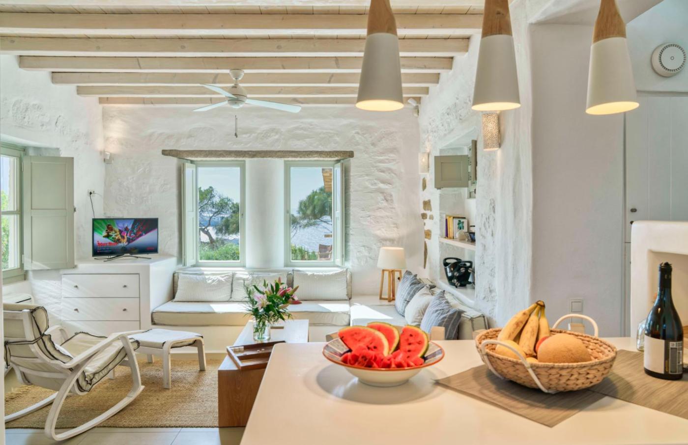 Traditional House with sea view. This split level Cycladic-style house offers sea and pool views. The ground floor consists of a living room with 2 sofa beds, kitchen with dining area and bathroom, while the 2 bedrooms as well as another bathroom are located on the second floor. A guest room equipped with a kitchenette, en suite bathroom and a privet patio is located at the lower level. Facilities include a smart TV with free NETFLIX and free WiFi. ;