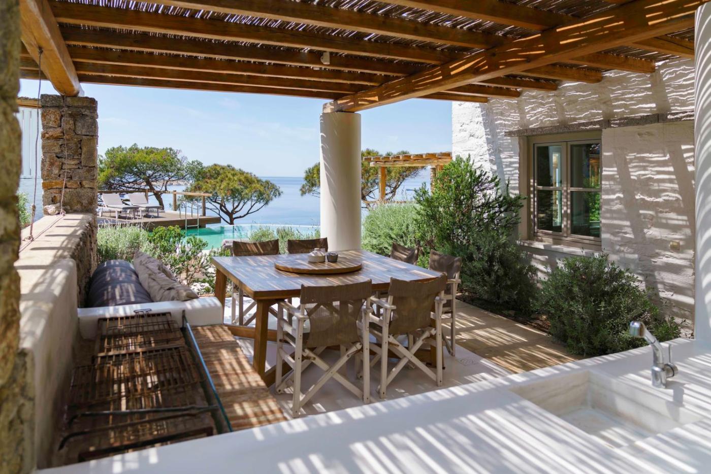 Five-Bedroom House. This five-bedroom house is ideal for groups of up to 10 guests. It consists of two detached buildings: the main house and the guest house. The main house hosts up to 8 guests and has a living room with sofa beds, a dining table, a small, fully equipped kitchen on the ground floor and four bedrooms on split levels (two of them have a shower room en suite while the other two share a shower room situated next to them). There are four shower rooms in total. The guest house hosts up to 2 guests, and it features a living room with built-in sofas, a kitchenette and a lavatory on the ground floor and a large bedroom and shower on the upper floor. The complex isup around an infinity pool of 50sqm. There are spacious outdoor areas (sundecks, shaded patios, a bbq, gardens with aromatic plants and a parking area) exclusively for you and your party to enjoy.