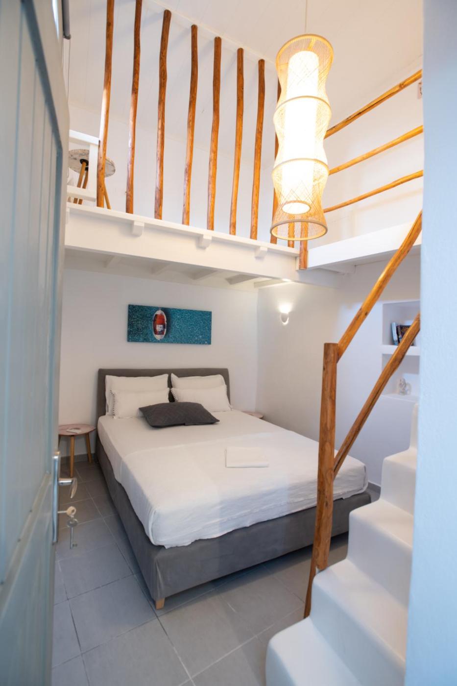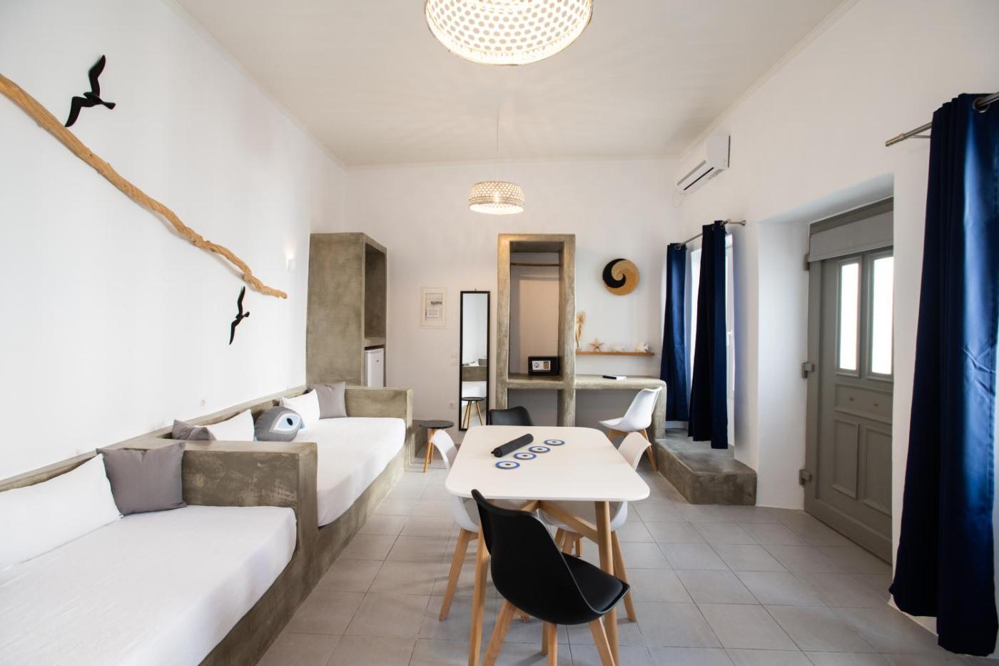 Apartment. This newly renovated apartment offers the group the chic, modern style of the island. Its convenient location offers a multitude of choices for bars, restaurants, clubs, and stores. Moreover, the boat taking visitors to Delos is 2 minutes away. The room consists of one main bedroom with 3 beds and 2 sofa beds in the living room. This apartment is 1(#3) of 3 different apartments with a common entrance. Ideal for a group to enjoy the nightlife of the town. (located on top of Porta bar).