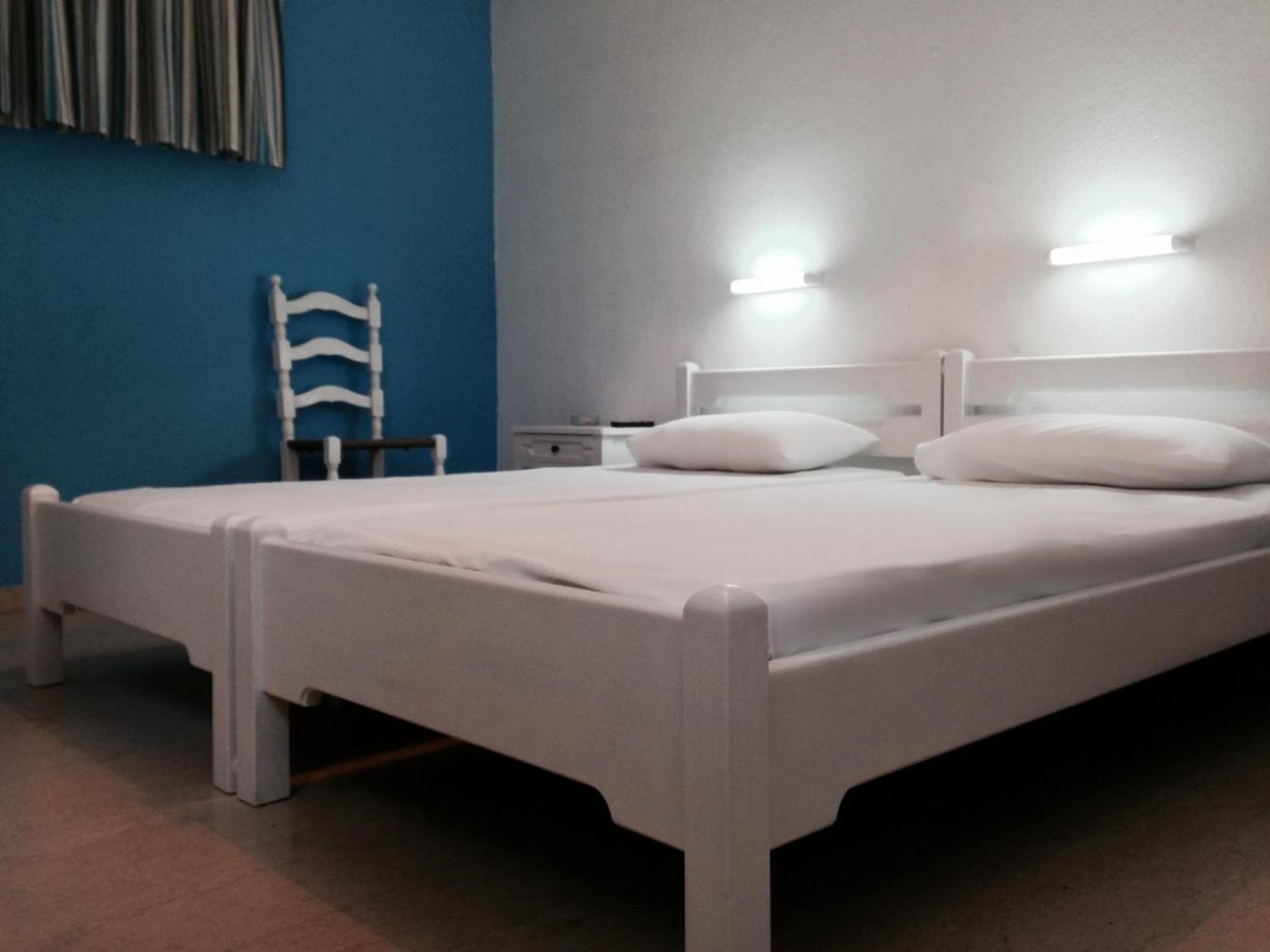 Quadruple Room. Simple and functional room with white walls and wooden furniture. Amenities include a refrigerator, air conditioning, two digital TV, hairdryer, safebox and shower. ;