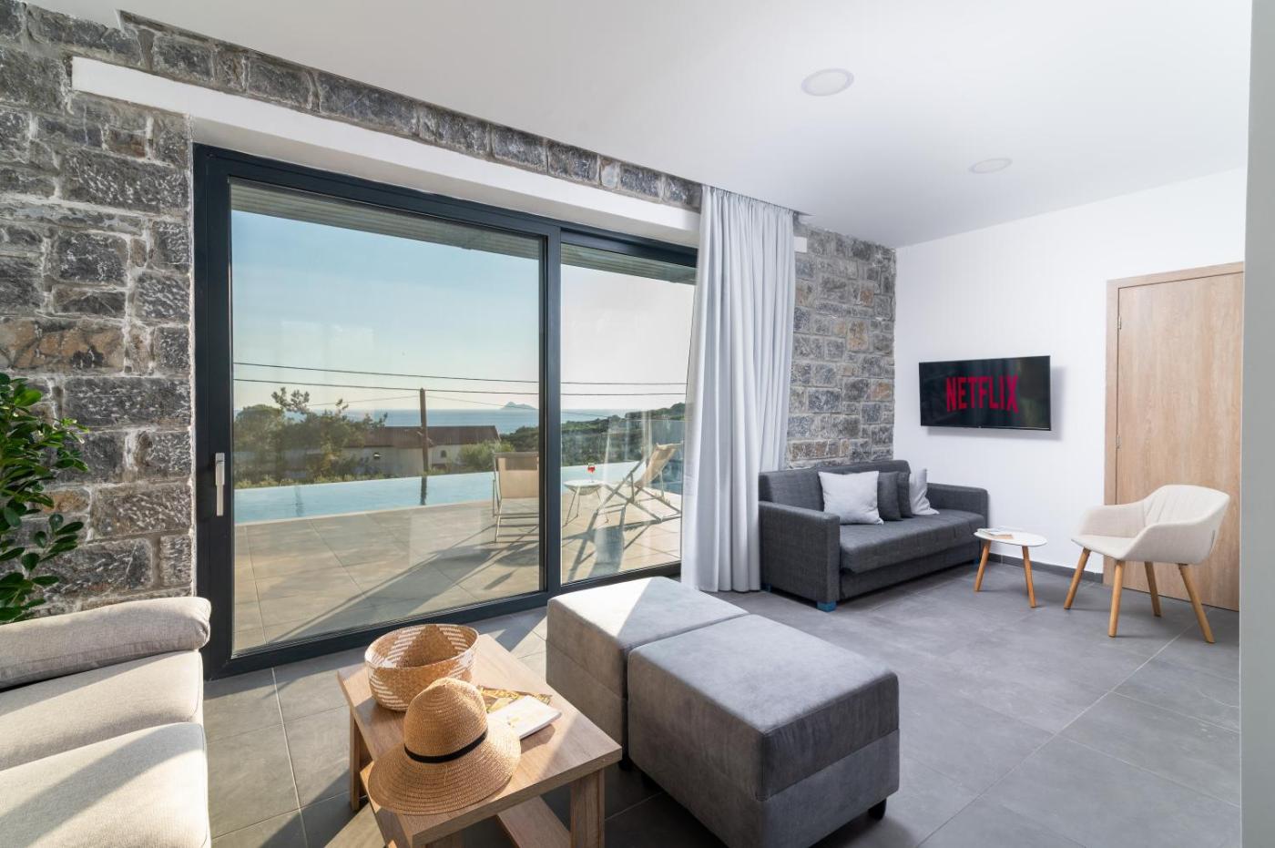 Three-Bedroom Villa. This villas standout feature is the pool with a view. Boasting a private entrance, this air-conditioned villa includes 1 living room, 3 separate bedrooms and 2 bathrooms with a walk-in shower. Guests will find a stovetop, a refrigerator, a dishwasher and kitchenware in the fully equipped kitchen. The villa also features a barbecue. Featuring a terrace with sea views, this villa also offers a washing machine and a flat-screen TV with satellite channels. The unit has 5 beds.